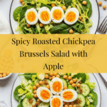 A vibrant and nourishing Spicy Chickpeas and Brussels Salad featuring roasted chickpeas with bold spices, fresh Brussels sprouts, crisp Granny Smith apple, baby spinach, tangy Parmesan, pine nuts, golden raisins, and hard-boiled eggs, all brought together with a zesty lemon and mustard vinaigrette. Perfect as a hearty lunch or a flavorful side dish.