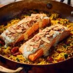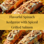 - Serve: Top the spinach kedgeree with the grilled salmon fillets or gently flake the fish into the rice mixture. Sprinkle toasted almonds over the dish for a satisfying crunch and serve immediately.