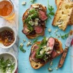 - Step 7: Spread the toasted bread slices with the blue cheese mixture. Top with sliced steak, sticky caramelised onions, a handful of rocket, and a final grind of black pepper.
