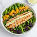 A white bowl holds a fresh salad arranged in layers, starting with a base of mixed green and purple leafy lettuce, scattered with orange slices and walnut pieces. On top sits a sliced, cooked chicken breast with a light golden-brown surface. A creamy, pale green sauce is drizzled evenly across the chicken slices from one side to the other. Next to the bowl on a white marbled surface is a small white bowl filled with the same sauce. The photo is taken with natural light that softly highlights the fresh colors and textures. photo taken with an iphone --ar 4:5 --v 7
