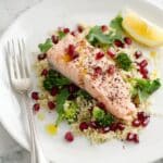 Keywords: salmon salad, couscous salad, healthy seafood recipe, steamed salmon, broccoli salad, pomegranate seeds, watercress salad, easy healthy meal