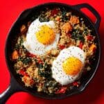 You can cook the eggs any way you like—fried, poached, or scrambled—then top the skillet just before serving to add extra protein and richness.