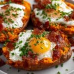 The image shows three baked sweet potato halves on a white plate, each topped with several layers. The base layer is the orange, soft, mashed sweet potato with a slightly roasted outer skin. On top of the nearest sweet potato is a cooked sunny-side-up egg with a bright yellow yolk and white cooked edges, sprinkled with black pepper. Each potato is also topped with small pieces of crispy bacon that have a reddish-brown color and dollops of white sour cream. The finishing touch is a generous sprinkle of finely chopped green chives scattered on the potatoes and the plate. The scene is set on a white marbled surface. photo taken with an iphone --ar 4:5 --v 7