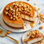 - Serve and Garnish: Once fully set, remove the cheesecake from the tin. Drizzle the surface generously with maple syrup. Scatter caramel popcorn over the top and finish with a pinch of sea salt for a perfect balance of flavors. Slice and serve chilled.