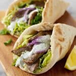 Store any leftover lamb covered in the refrigerator for up to 2 days. Reheat gently in a low oven or covered skillet to keep it tender. Pitta bread is best served fresh; however, you can wrap it separately and warm it before serving. Keep yogurt-based sauces refrigerated and use within 2 days.