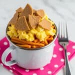 A close-up of a white metal cup filled with a mixture of different layers. The bottom layer shows thin, slightly crispy orange snack sticks, followed by a layer of soft scrambled eggs with a yellowish color. On top, there are irregular pieces of a brown flat snack or cracker, scattered over the mix. The cup is placed on a bright pink napkin with white polka dots, and there is a shiny silver fork next to it on a white marbled surface. Photo taken with an iphone --ar 4:5 --v 7