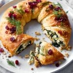 This Vegan Christmas Wreath is a festive and flavorful savory pastry perfect for holiday celebrations. Filled with a creamy mixture of silken tofu, spinach, pine nuts, fresh herbs, and dried fruits, it’s wrapped in a golden, flaky vegan shortcrust pastry. The wreath is beautifully decorated with dill fronds and dried cranberries, making it both a delicious and eye-catching centerpiece for your vegan holiday feast.