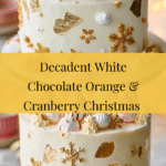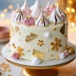 This festive White Chocolate, Orange & Cranberry Christmas Cake is a moist and beautifully flavored layer cake enriched with velvety white chocolate and fresh orange zest, layered with tangy cranberry compote and a luscious cream cheese and white chocolate frosting. Perfectly festive and elegant, it’s decorated with meringue kisses, edible snowflakes, and optional gold leaf to create a stunning centerpiece for holiday celebrations.